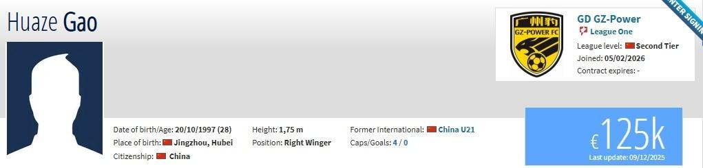 北京时间2月5日,德转更新,原石家庄功夫球员高华泽、王靖斌加盟广东广州豹。